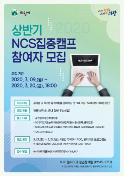 의왕시(시장 김상돈)는 지난해 ‘청년 취업캠프’를 운영하면서 NCS(국가직무능력표준)시험 대비반을 운영한 결과, 좀 더 심도 있는 교육을 희망하는 청년이 많았기에 올해 처음으로 ‘NCS직업 기초능력 평가 집중캠프’를 운영한다고 밝혔다.