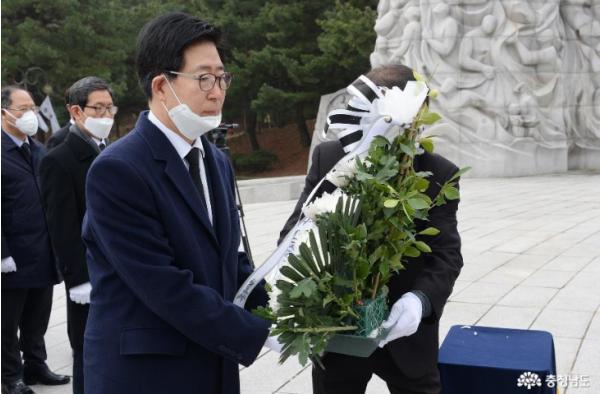 양승조 충남지사는 1일 제101주년 3.1절을 맞아 독립기념관 및 유관순 열사 추모각에서 이우성 문화체육부지사 등 도 간부 공무원 20여 명과 함께 참배했다.