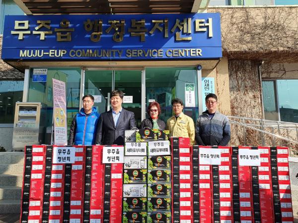 무주군에는 ‘코로나19’로 인한 사회적 고충을 덜고 취약계층의 어려움을 헤아리기 위한 손길들이 줄을 잇고 있다. 지난 2일에는 무주읍청년회에서 사과 1백 박스(1백만 원 상당)를 무주읍행정복지센터에 기탁했다.