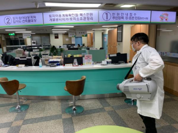 방역작업은 평소 민원인의 방문이 잦은 본관 1층(민원실)을 대상으로 실시하며 소독약으로 인한 자극이나 건강상의 문제를 고려하여 내방하는 민원인과 근무직원이 가장 적은 아침 또는 저녁시간을 이용하여 실시한다.