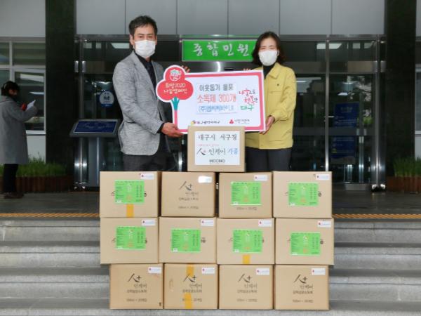 또한, (주)엠씨씨바이오(대표 정태근)는 26일 서구청을 방문해 코로나19 예방을 위해 소독제 300개를 기부했다.