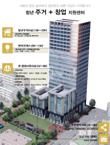 송파청년복합시설은 노후 공공청사 방이2동주민센터를 포함한 1만 1277㎡ 부지에 지하 3층~지상 22층 규모로 들어서는 시설이다. 젊은층 주거안정, 일자리 창출 및 지역 공공서비스 향상 등을 목표로 한국토지주택공사(LH)와 손잡고 구 역점사업으로 추진하고 있다.