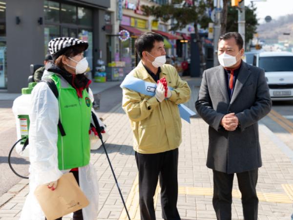 현장사무실 두 곳을 차례로 방문한 김태경 의장은 코로나19 사태에 적극 대응하며 지역사회 확산 방지를 위해 애쓰고 있는 통합방재단의 노고를 격려했다.