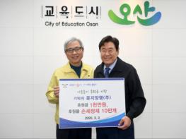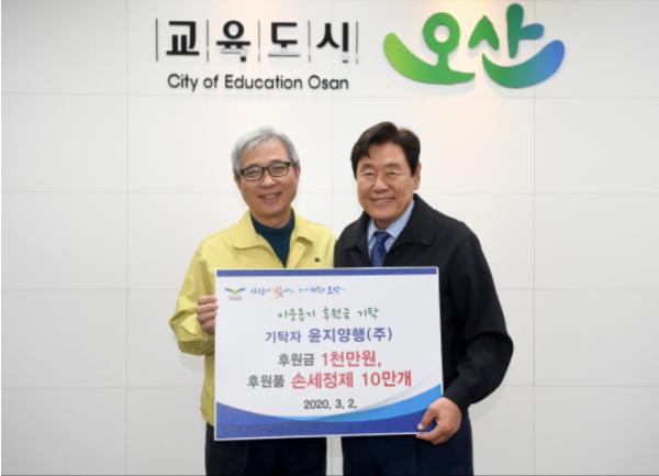 오산시 가장동에 소재한 윤지양행㈜(대표 윤용만)이 2일 코로나19 예방을 위해 일회용 손세정제 십만 개와 성금 1천만원을 오산시에 기탁했다.