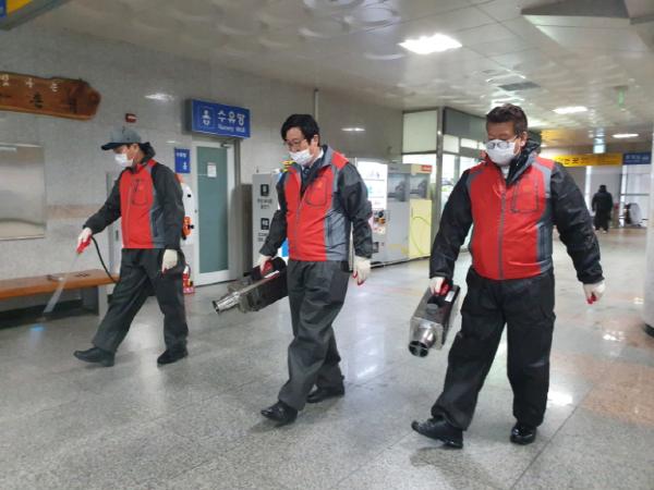 이날 시의원들은 마스크와 방역복을 갖춰 입고 초 미립자 살포기와 살균제로 역사 주변을 소독 하는 등 방역에 힘썼다.