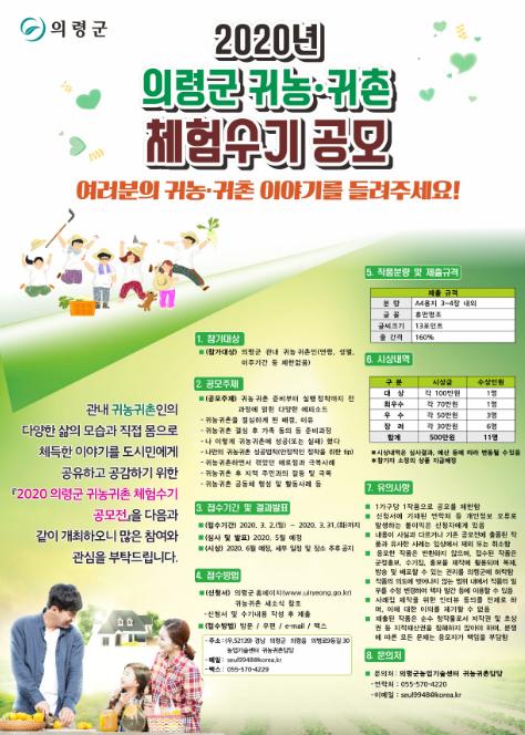 경남 의령군은 관내 귀농?귀촌인을 대상으로 귀농귀촌 체험수기 공모전을 실시한다고 밝혔다.