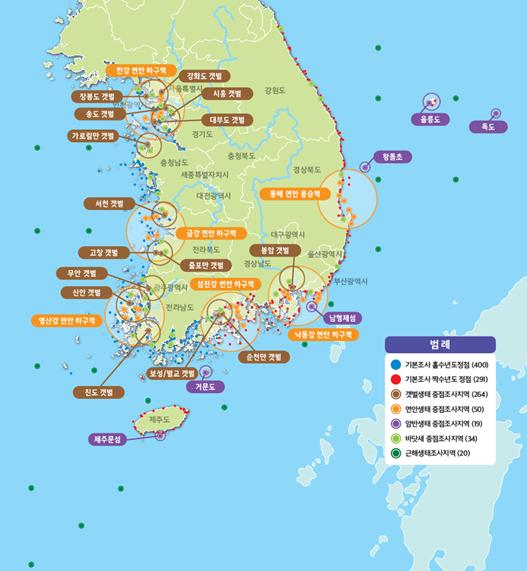 또한, 이번 조사에서는 전체 갯벌 퇴적물의 평균 입자 크기가 모래와 점토의 중간크기 정도(중립 실트)이고, 2015년 이후 거의 변화가 없다는 것도 확인되었다. 아울러, 갯벌을 대표하는 저서동물 3개 분류군(다모류, 갑각류, 연체동물)도 세 번에 걸친 조사(‘15, ’17, ‘19)에서 일정한 비율로 나타나 우리나라 서해·남해서부 갯벌이 안정된 생태계를 유지하고 있음이 확인되었다. 암반생태계에 출현한 생물 종수도 502종으로, 2015년(544종)과 2017년(497종)에 비해 큰 변화가 없었다.