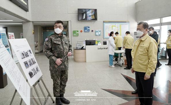 이날 국군대전병원 방문은 문 대통령이 지난달 25일 대구 방문 시 “국가 가용자원을 총동원해 대구?경북 지역을 지원하라”고 지시한 이후의 상황을 점검하고, 군 의료진을 격려하기 위한 것이다.
