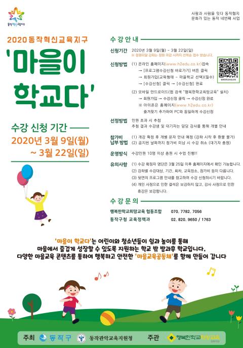「마을이 학교다」는 2020 동작혁신교육지구사업의 일환으로 지역 내 교육 자원을 활용해 어린이·청소년에게 쉼과 놀이가 있는 창의체험 위주의 교육콘텐츠를 제공하는 프로그램이다.