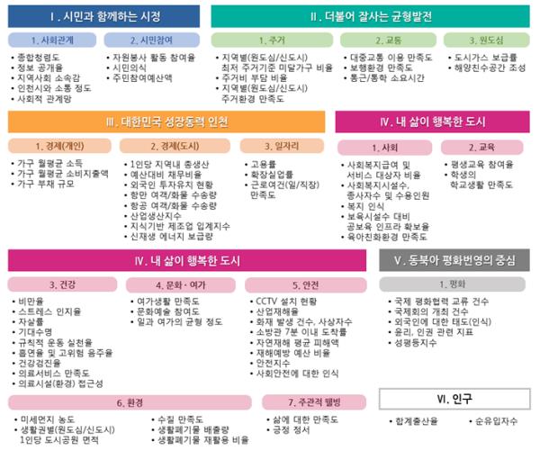 인천시 지역웰빙(행복) 지표는 인천시민, 시민단체, 실?국, 의회, 인천시 유관기관 등을 대상으로 수차례 의견수렴 과정을 통해 이루어졌으며, 최종 행복지표는 시정목표와 연계한 인천시 시민행복의 증진을 목표로 총 6개 분야, 17개 영역, 71개 세부지표를 선정하였다.