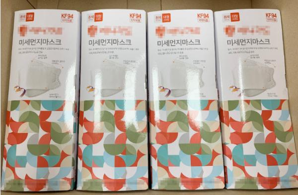 받은 사람이 주민생활지원과로 돼 있는 해당 박스에 든 물품은 코로나19로 인해 시중에서 구하기 어렵다는 어른용 kf94 마스크 4박스, 100매였다.