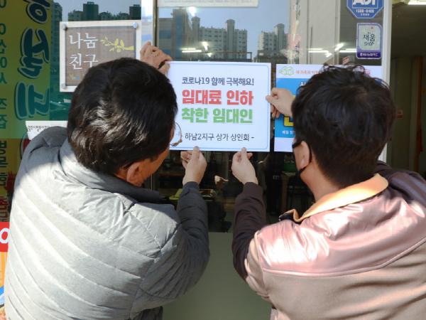 지난달 24일 1913송정역시장 건물주들이 시작한 광산구 자발적인 임대료 인하 움직임은, 이달 2일 하남2지구 골목상권까지 전파됐다. 하남2지구 임대인 4명은, 이날 상생협력의 의미로 11개 상가 임차인에게 한시적으로 임대료를 10∼30%를 인하하겠다고 밝혔다.