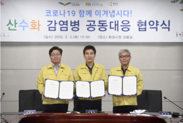 이에 화성시청 상황실에서 열린 협약식에서 곽상욱 오산시장과 염태영 수원시장, 서철모 화성시장은 코로나19 선제적 대응과 위기 극복을 위해 힘을 모으기로 했다.