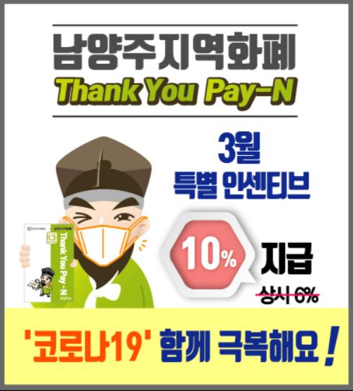 남양주시(시장 조광한)는 코로나19 확산으로 매출이 급감한 소상공인을 살리고, 침체된 지역경제를 활성화시키기 위해 3일부터 남양주지역화폐(Thank You Pay-N) 인센티브를 6%에서‘10%로 상향하여 지급’한다고 밝혔다.