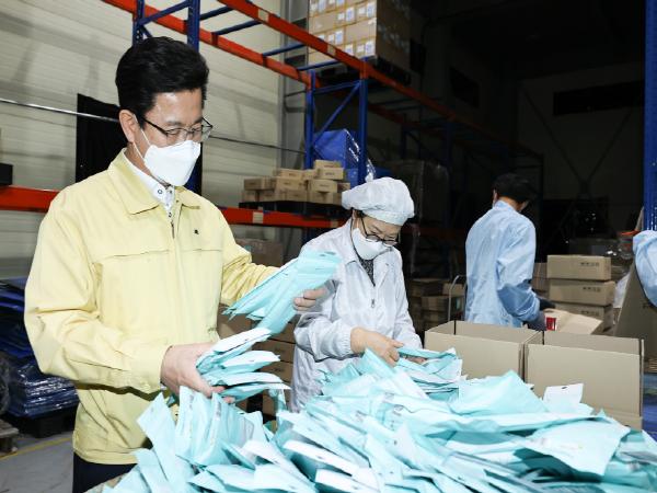 허태정 대전시장은 이날 마스크 제조현장을 찾아 구별 배분상황을 점검하고 신속한 조치를 당부했다.