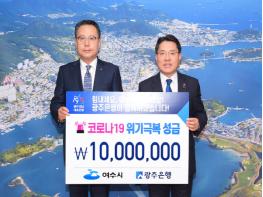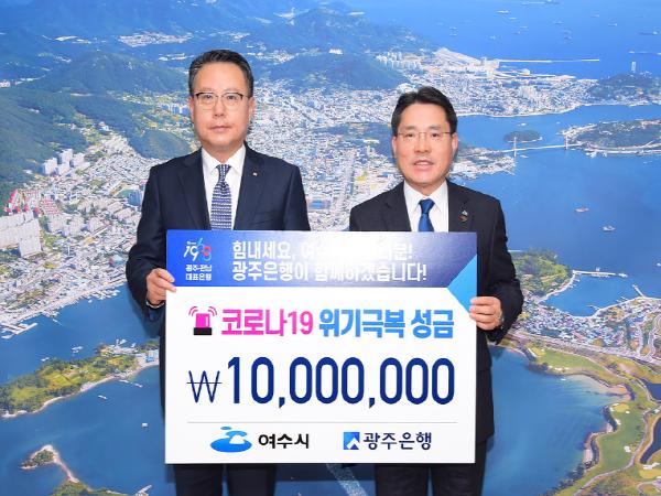 여수시(시장 권오봉)에 따르면 광주은행(은행장 송종욱)이 지난 2일 권오봉 여수시장에게 코로나19 확산 방지 및 취약계층 지원을 위한 1000만 원의 후원증서를 전달했다고 밝혔다.