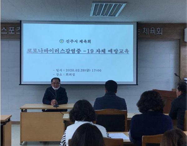 진주시체육회(회장 김택세)는 지난 2월 28일 체육회 회의실에서 진주시체육회 및 진주시장애인체육회 직원을 대상으로 코로나바이러스감염증-19(COVID-19) 예방 수칙과 사무실 위생관리, 증상 발생 시 대처 요령 등에 대하여 교육을 실시하였다.