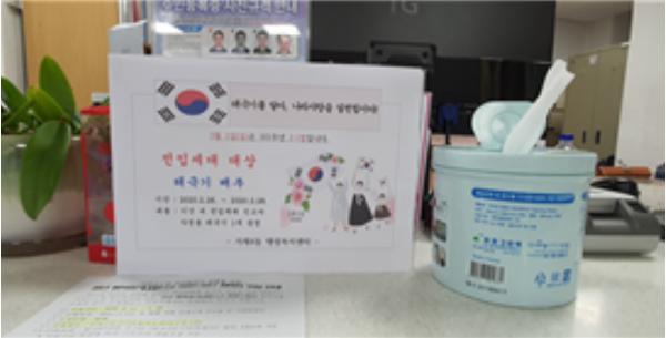 연제구 거제4동(동장 김윤신)은 제101주년 3.1절을 맞아 2월 26일부터 28일까지 전입신고를 하러 온 방문 민원인에게 가정용 태극기를 증정했다.