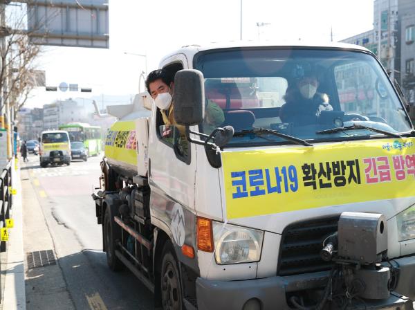 구는 코로나19 확산에 따른 지역사회 감염 예방에 선제적 대응을 위해 3.5톤 살수 차량 2대의 분무 위치 및 노즐 규격을 변경하여 코로나19 방역 활동에 투입했다.