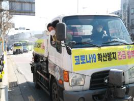 관악구(구청장 박준희)가 도로 살수 차량을 이용해 코로나19 방역업무를 수행하고 있어 화제다.