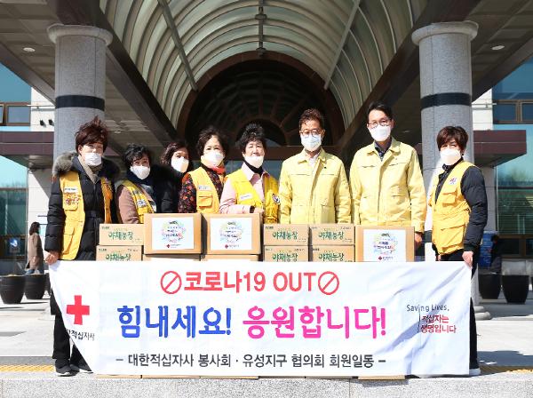 대한적십자봉사회 대전세종시자 유성지구 협의회(회장 이순자)도 일선 현장에서 코로나19 극복을 위해 땀 흘리고 있는 구청과 보건소 직원들에게 음료수 등 격려품을 전달했다.