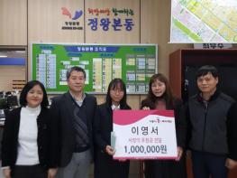 이번에 기탁한 100만원은 시흥시1%복지재단을 통해 코로나19로 어려움을 겪고 있는 정왕본동 내 자녀가 있는 저소득 가정들에게 지정기탁 될 예정이다.