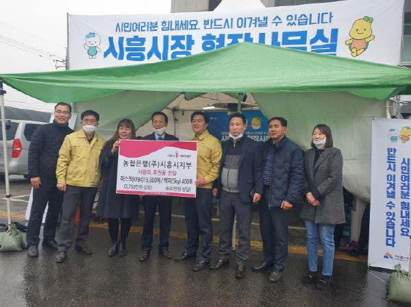 농협은행 시흥시지부에서는 코로나19에 도움이 됐으면 한다며 마스크(KF-94) 1만5,000장과 백미(5kg) 400포를 기부했다. CNS코리아는 손소독제(60ml) 2,550개와 소독제(4L) 100개를 기부했고, TG코리아는 방진용 마스크 1만개를 기부해 7일 수령할 예정이다. 기부된 위생용품은 관내 행정복지센터에서 저소득층 및 취약계층에게 배부할 계획이다.
