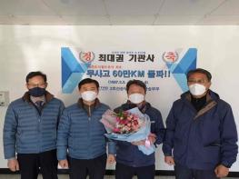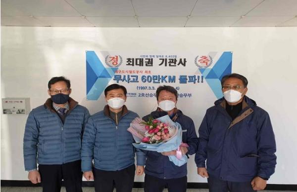 대구도시철도공사(사장 홍승활)는 지난 3월 4일(수) 문양역에서 영남대 방면으로 운행 중이던 제2019열차가 11시 21분경 다사역에 정시 도착함으로써 이 열차를 운전하던 2호선승무사업소 소속 최대권(51세) 기관사가 대구도시철도공사 최초로 무사고 운행 60만km를 달성하는 주인공이 됐다고 밝혔다.