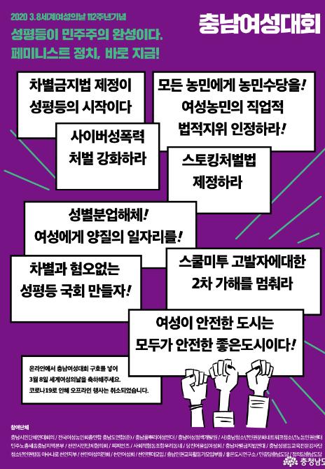 신종코로나19 확산 방지를 위해 당초 계획되었던‘충남여성대회’집회행사는 취소했으나 성평등 충남을 위한 의제를 선정하여 SNS(유투브)와 플랜카드를 15개 시·군 전역에 설치하는 등 세계여성의 날의 의미를 홍보하고 있다.