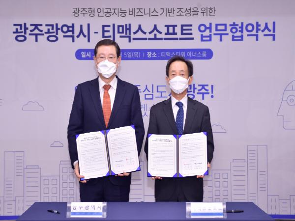 광주시는 5일 이용섭 시장과 ㈜티맥스소프트 박대연 회장 등이 참석한 가운데 경기도 분당에 있는 ㈜티맥스소프트 본사에서 ‘광주형 인공지능 비즈니스 기반 조성’을 위한 업무협약을 체결했다.