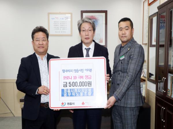 정읍시청 자치단체 공무직노동조합(위원장 이상연)은 6일 코로나 19 극복을 위한 성금 50만 원을 정읍시에 전달했다.
