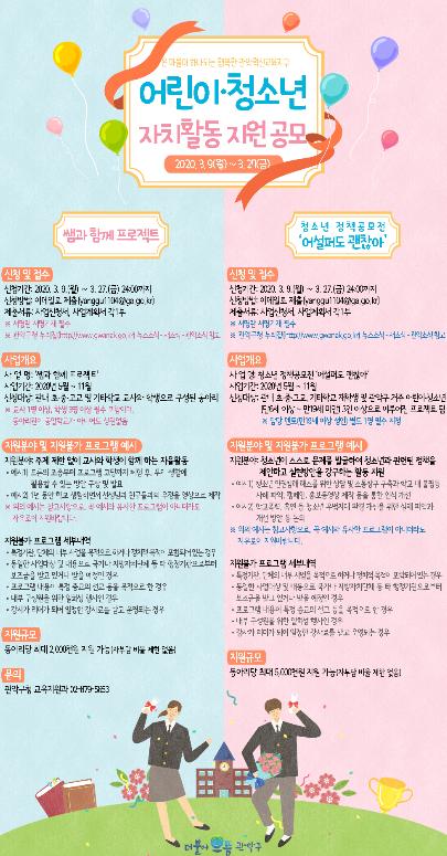 관악구(구청장 박준희)가 2020년 관악혁신지구 ‘어린이·청소년 자치활동 지원’ 분야 사업 참가자를 오는 27일까지 모집한다고 밝혔다.