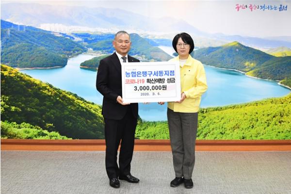 지난 6일 농협은행 구서동지점(지점장 한태규)은 금정구를 방문해 성금 3백만 원을, 금정구불교연합회회(회장 고담스님)는 성금 2백만 원을 기탁하였다. 기탁된 성금은 방역물품 구매에 사용될 예정이다.