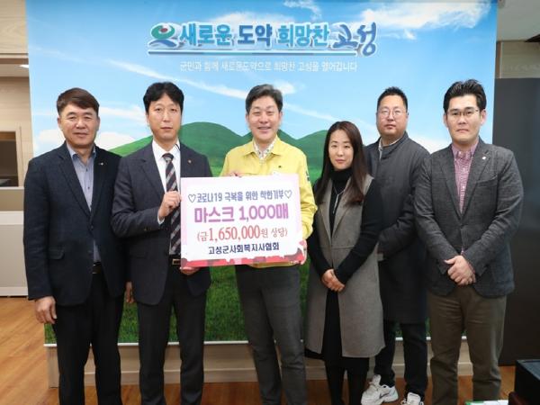 경남사회복지사협회 고성군지회(회장 이종수)는 지난 9일 고성군청을 방문해 코로나19 확산 방지를 위해 써달라며 마스크 1000장(165만 원 상당)을 전달했다.