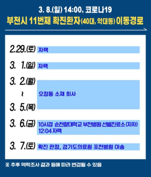 지난 3월 7일 확진 판정을 받은 40대 약대동 거주 남성 환자는 2월 29일 자택, 3월 1일 자택, 3월 2일~3월 5일 오정동 소재 회사, 3월 6일 10시경 순천향대학교 부천병원 선별진료소(자차이용), 12시 04분 자택, 3월 7일 확진 판정 후 경기도의료원 포천병원으로 이송됐다.