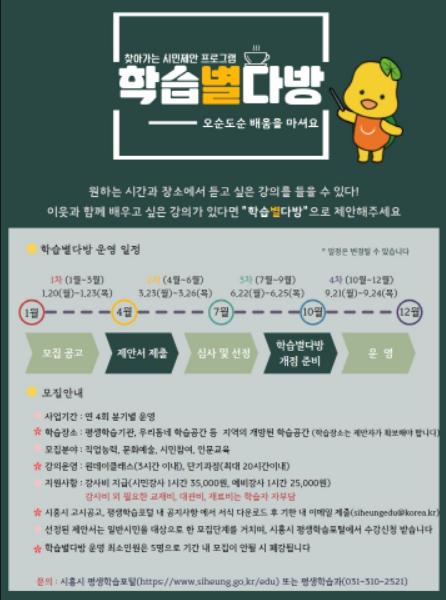 시흥시(시장 임병택)는 학습자들이 원하는 시간과 장소로 찾아가는 시민맞춤형 평생교육 서비스인 「학습별다방」2분기 제안서를 오는 3월 23일부터 26일까지 모집한다.
