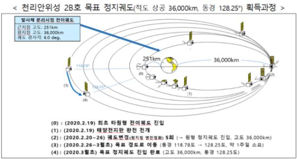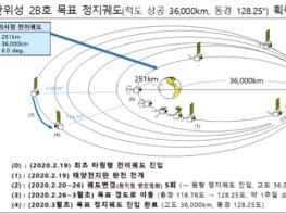 지난 2월 19일 발사에 성공한 천리안위성 2B호는 다음날 20일(목)부터 26일(수)까지 7일간 총 5회의 궤도변경 과정을 거쳐 최초 타원형 전이궤도에서 고도 35,786km, 동경 118.78도의 원형 정지궤도에 정상 진입하였다.