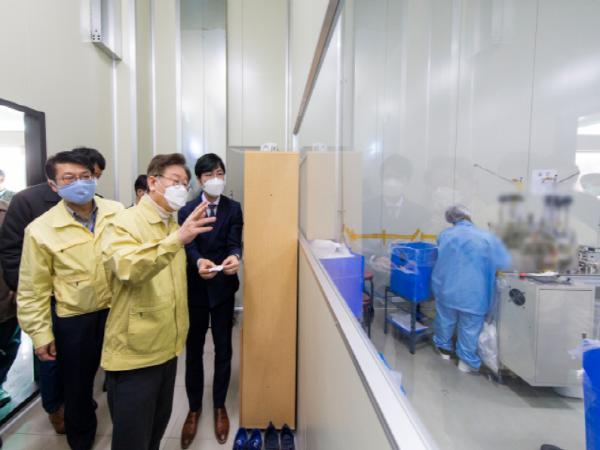 이재명 경기도지사가 도내 마스크 제조업체를 찾아 현장 관계자들과 마스크 생산 확대 방안을 논의했다.