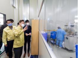 이 지사는 9일 안성시 양성면의 마스크 제조업체 와이제이코퍼레이션을 방문해 생산현장을 둘러보고 관계자들을 격려했다.