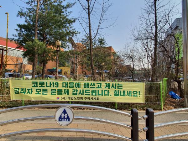 (사)대한노인회 구리시지회 장수용 지회장은“코로나19 대응에 애쓰고 계시는 공직자 모든 분들께 감사드립니다. 힘내세요”라는 현수막을 보건소 앞 대로에 게시하며 눈길을 끌었다.