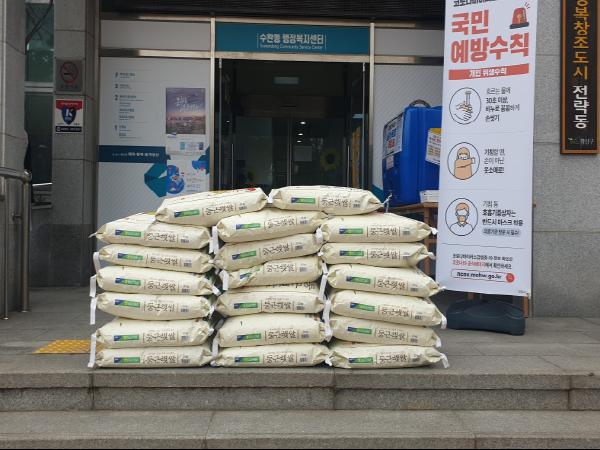 코로나19를 함께 극복하자는 기부가 광산구 곳곳에서 이어지고 있는 가운데, 6일 오후 수완동 행정복지센터에 ‘코로나19로 어려운 이웃을 도와달라’는 쪽지와 함께 20kg들이 쌀 20포가 익명으로 배달됐다.