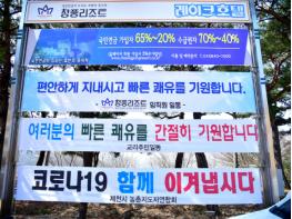 국민연금공단 청풍리조트에는 지난 7일부터 신종코로나바이러스 감염증(코로나 19) 치료를 위해 입소하는 환자들을 위로하고 응원하는 현수막이 내걸렸다.